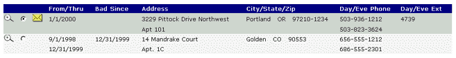 A listing of the current and past addresses for the borrower, as shown in the example below. The user can select any of these addresses by clicking on the magnifying glass icon. Once an address has been selected, the address information can be updated, or the address can be deleted from the system.