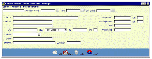 This window works the same way as the Borrower Services Borrower Address & Phone Information window does. See "Add a Borrower Address" for a detailed description of this process, including data entry and edit guidelines.