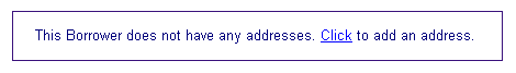 If the CLM does not contain any address information for the borrower, the pop-up window contains an informational message, as shown in the example below. From this window the user can only Add a new address.