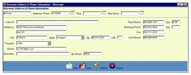 To exit this process without saving the address information, simply click on either the Borrower Address List browser window or the Borrower Information window at any time to close the pop-up Borrower Address & Phone Information data entry screen.