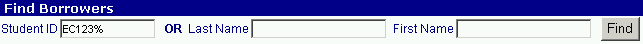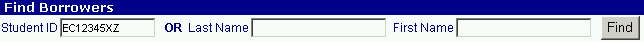 A borrower can be found by executing a search of the database using a partial or complete Student ID value. Note: the selected school must be utilizing Student IDs for this selection method to work. If the selected school is not using student IDs, no borrower records will be returned.