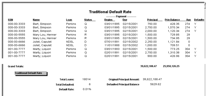 This report is produced when Traditional Default Rate is selected from the Reports drop-down list. The report is a listing or summary of all federal-type loans (Perkins, NDSL, and Defense), and displays the loans' current status, repayment begin date, payment due date, and principal amounts. For each loan, the loan's delinquency age is computed, and a flag displayed if the loan is considered to be in default. Only federal loans that have a status of "D", "P", "Q", "R" or "S" are selected for this report.